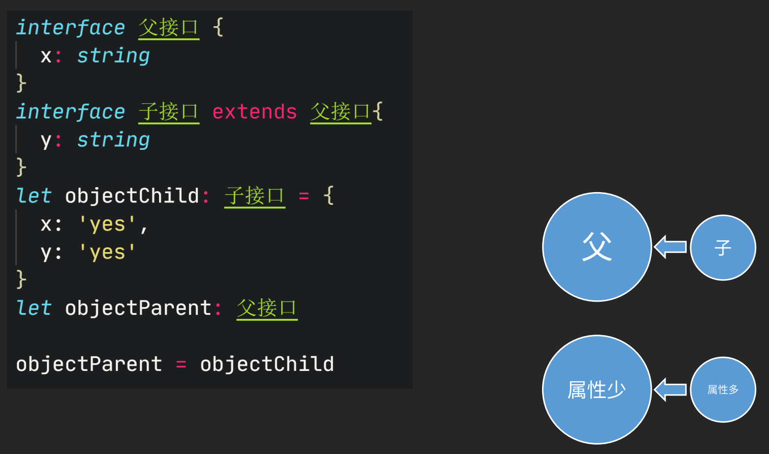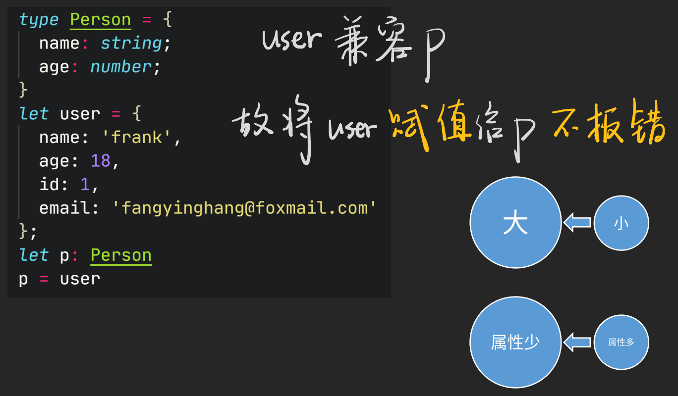 对象属性越多,限制越多,表示的集合范围越小,所以其实还是类型小的兼容类型大的