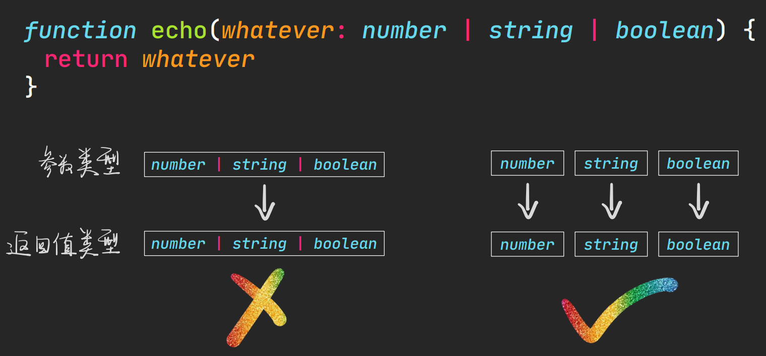 1 | function echo(whatever: number | string | boolean) { |