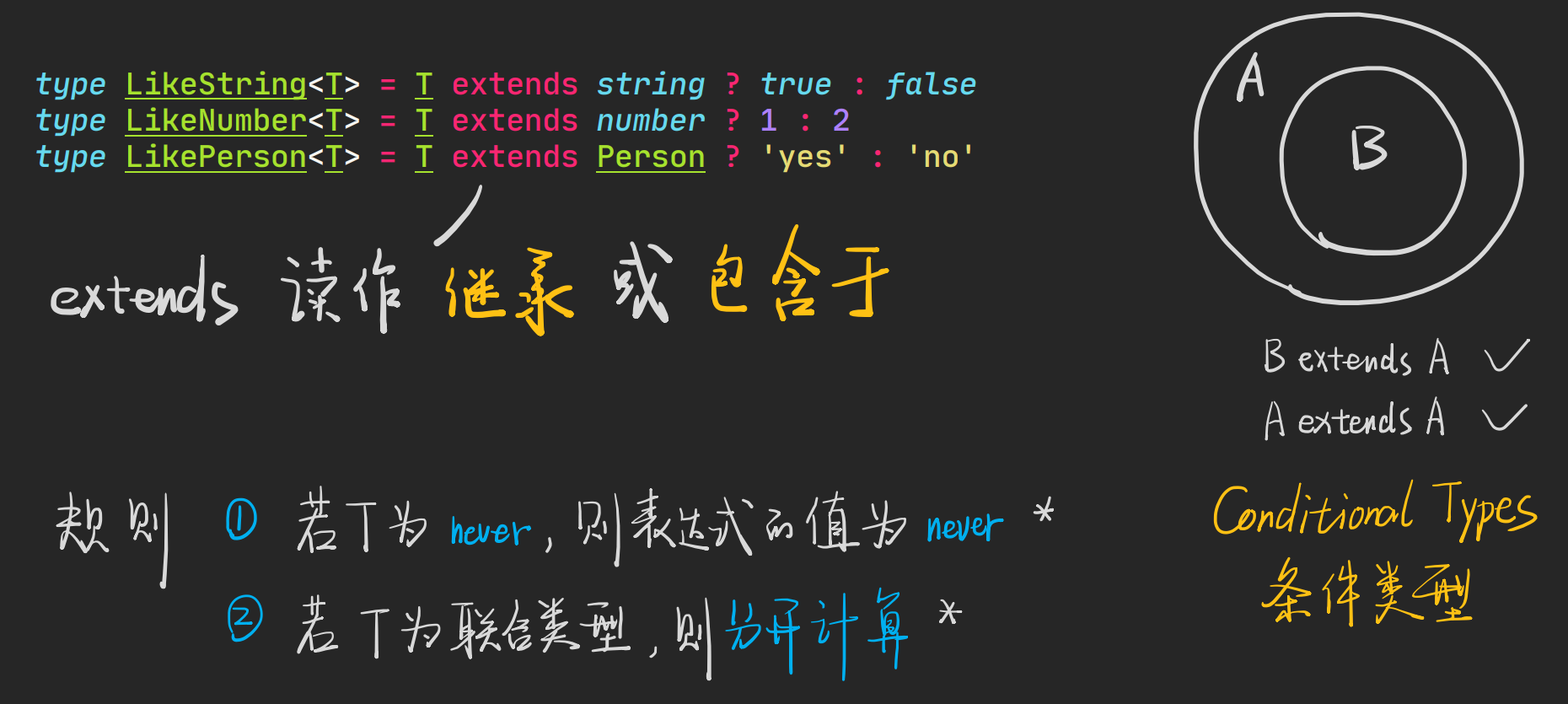 即泛型中的 never 进行任何运算(extends 运算或者 & 运算)都只会得到 never,这就好像是乘法中的零 0 X C = 0